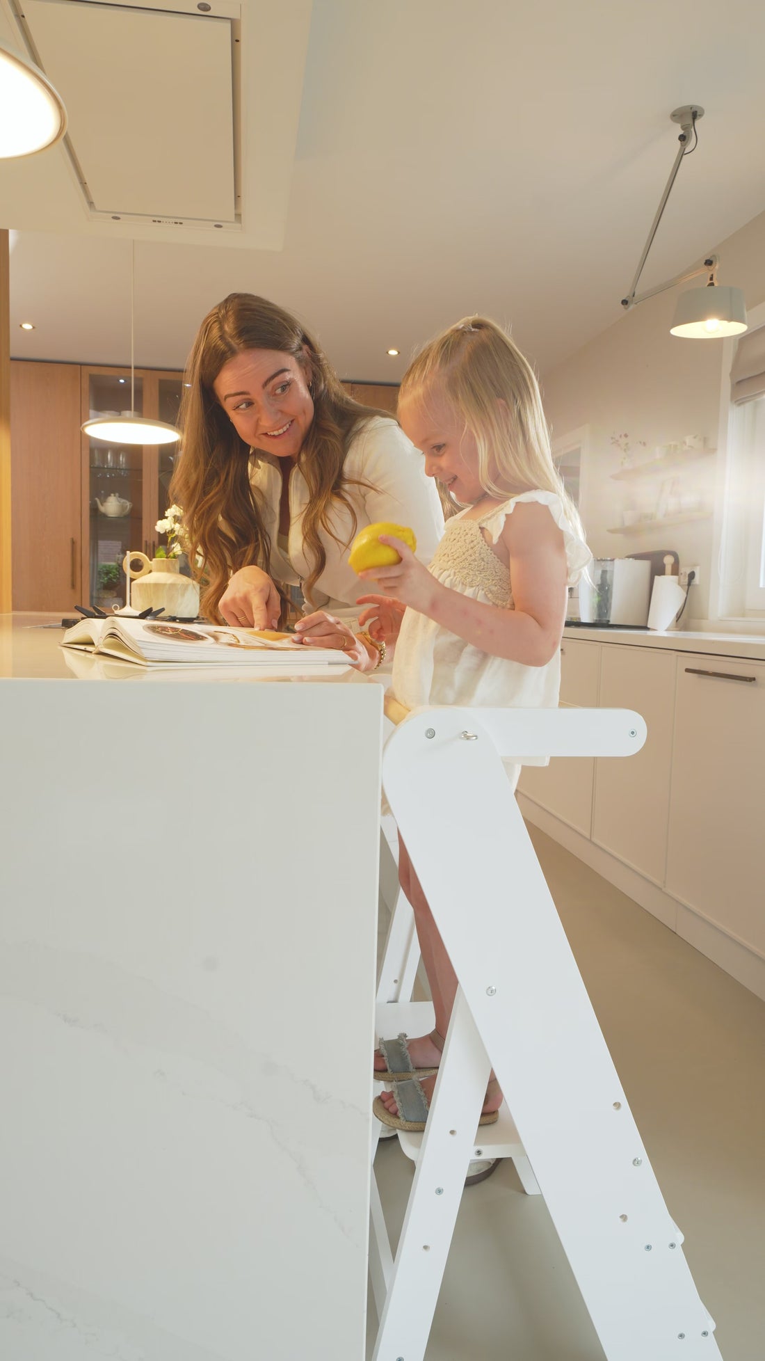 Een leertoren is een veilig, verhoogd platform waarop je kind zelfstandig op ooghoogte kan staan. Zo kan je peuter veilig meedoen zonder wiebelende krukjes of val gevaar.