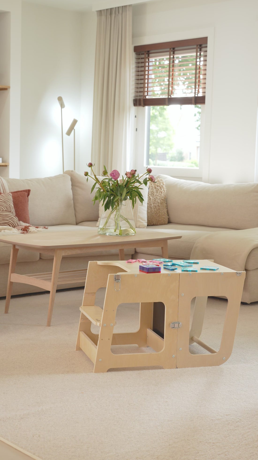 Een leertoren is een veilig, verhoogd platform waarop je kind zelfstandig op ooghoogte kan staan. Zo kan je peuter veilig meedoen zonder wiebelende krukjes of val gevaar.